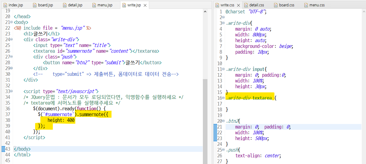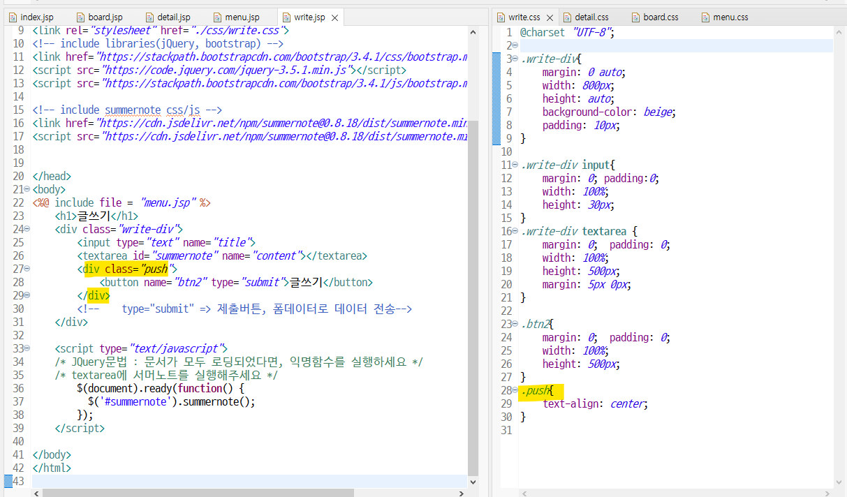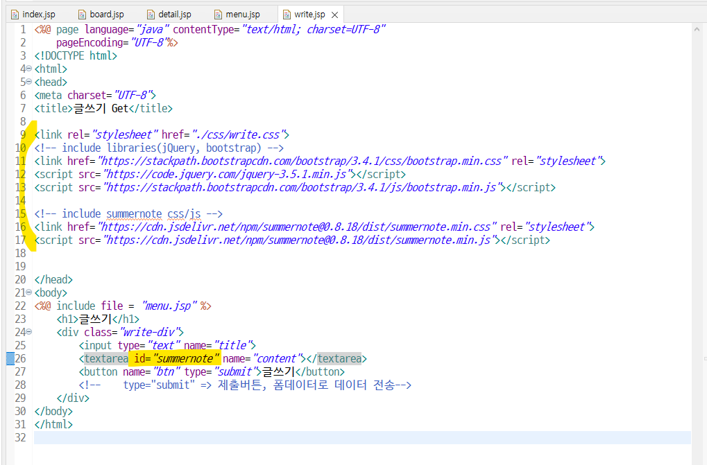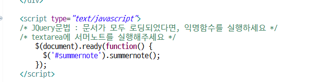 위에서 아래 코드 가져오고 id = "summernote" 추가