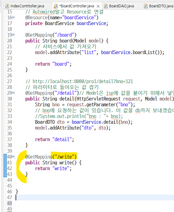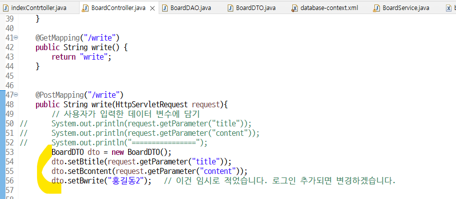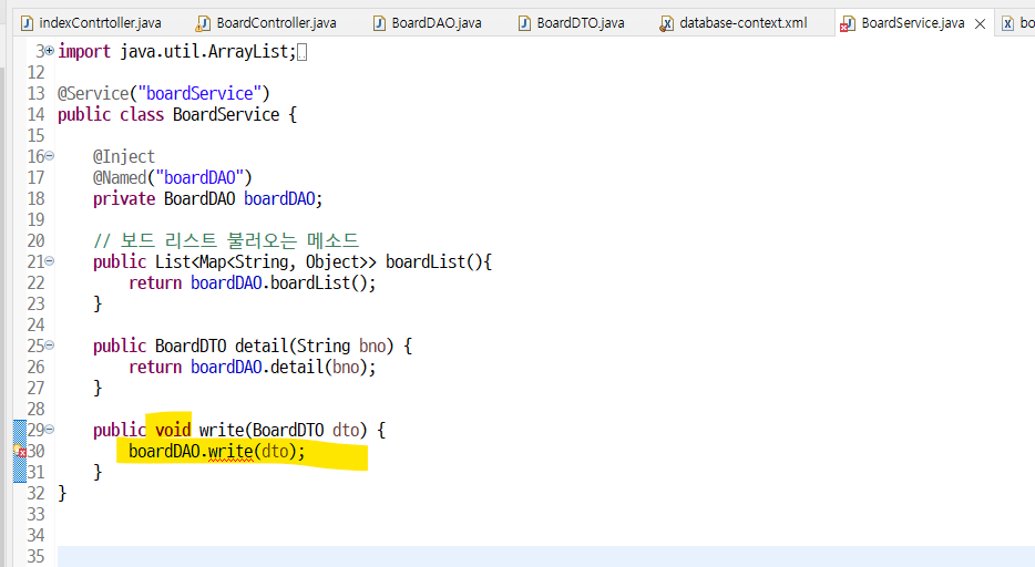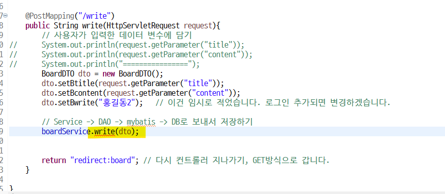 이제 서비스에서 다시 DAO로 던짐 _ write() 메소드로