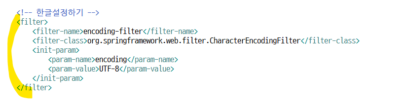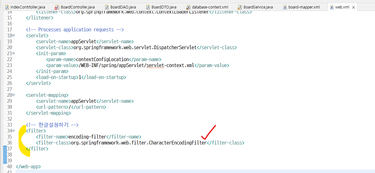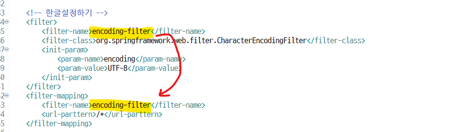 web.xml 에 filter 코드 입력 (체크부분 ctrl + space 눌렀을때 연결되면 성공)