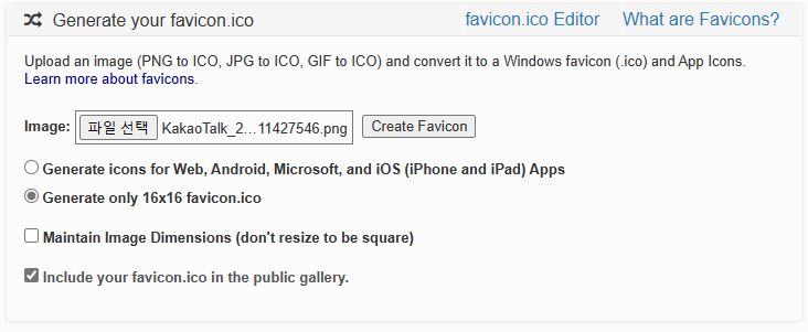 ' Generate only 16x16 favicon.ico ' 선택 => Create Favicon