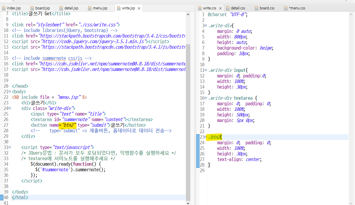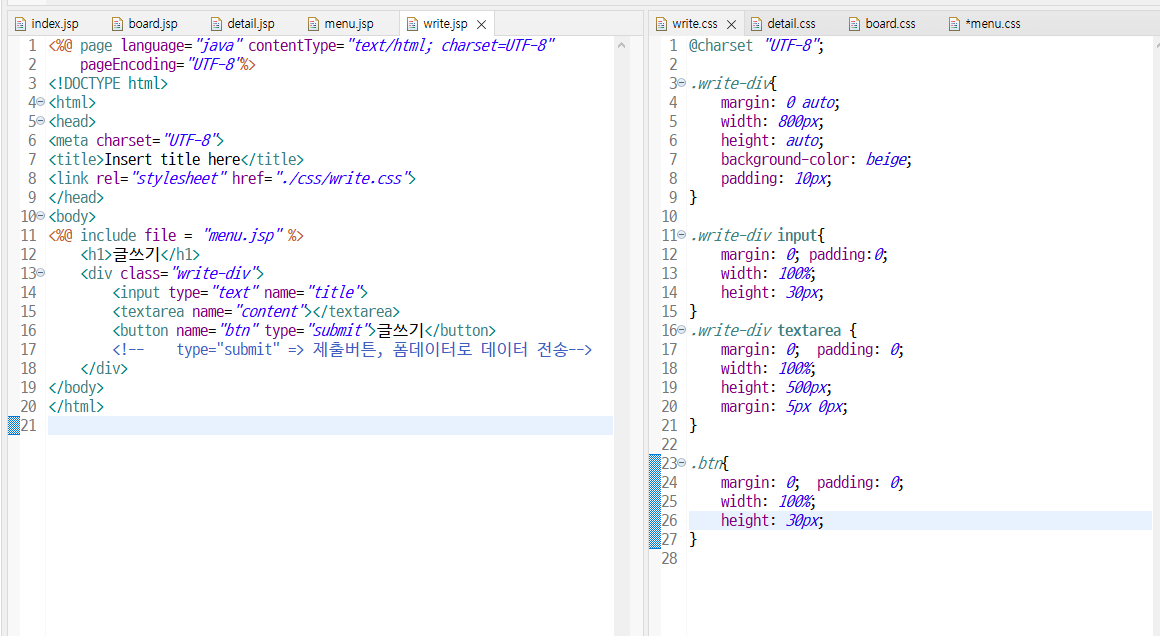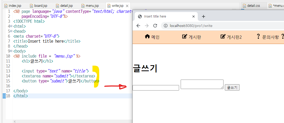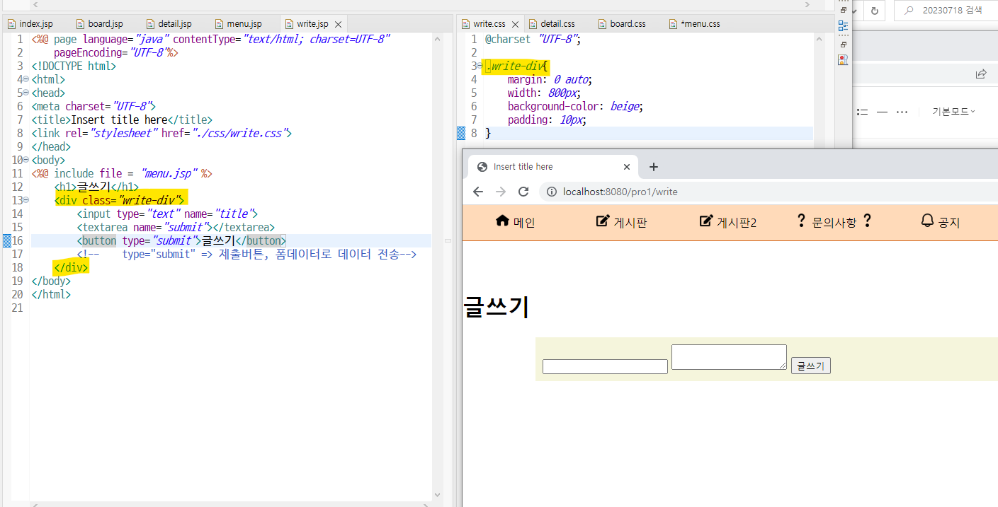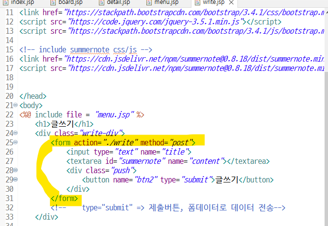 input ~ button까지 form 태그로 감싸주기 (form action으로 write 페이지로 넘겨줄거)