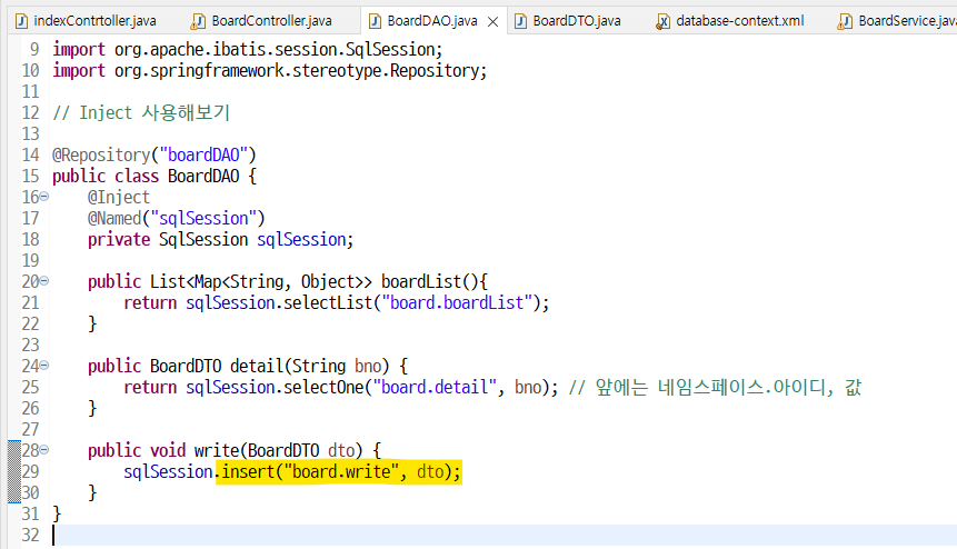 이제 DAO에서 dto를 받아서 insert() 를 통해 보냄