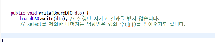 여기는 void라서 return 이 아니라 DAO 로 값을 바로 던짐. 위의 서비스에서도 dto값을 던지기만 했음
