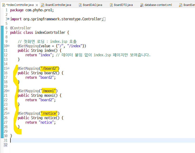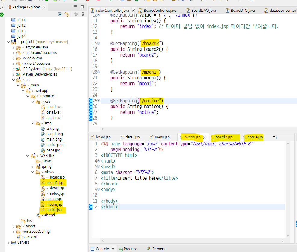 컨드롤러에서 메뉴바 게시판2, 문의, 공지 눌렀을 때 연결되도록 생성