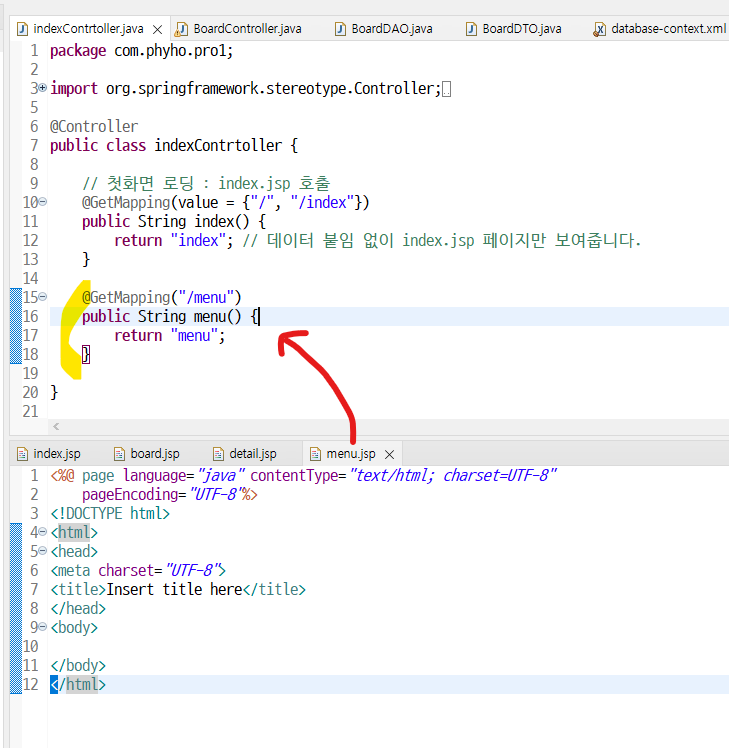 index 컨트롤러에 임시로 메뉴컨트롤러 생성할거
