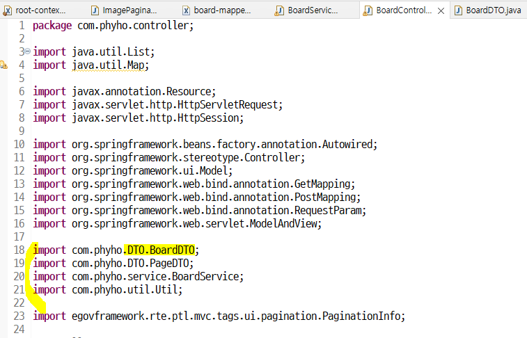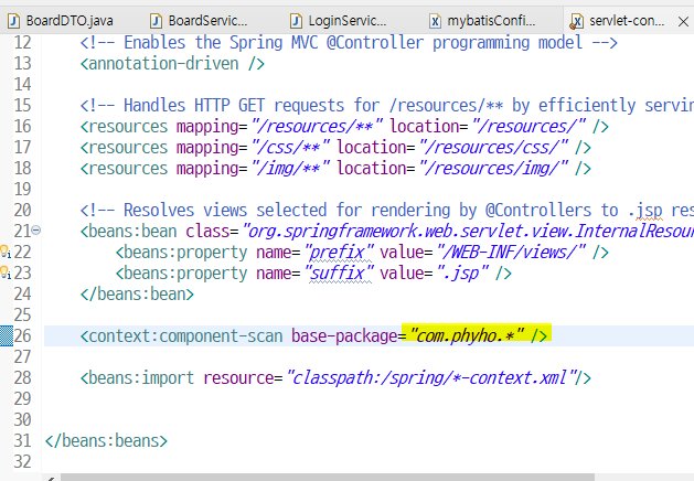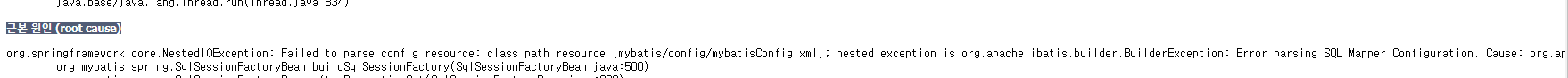org.springframework.core.NestedIOException: Failed to parse config resource: class path resource [mybatis/config/mybatisConfig.xml]; nested exception is org.apache.ibatis.builder.BuilderException: Error parsing SQL Mapper Configuration. Cause: org.apache.ibatis.builder.BuilderException: Error registering typeAlias for 'boardDTO'. Cause: java.lang.ClassNotFoundException: Cannot find class: com.phyho.pro1.BoardDTO