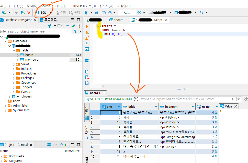 요기에서 쿼리문 실행