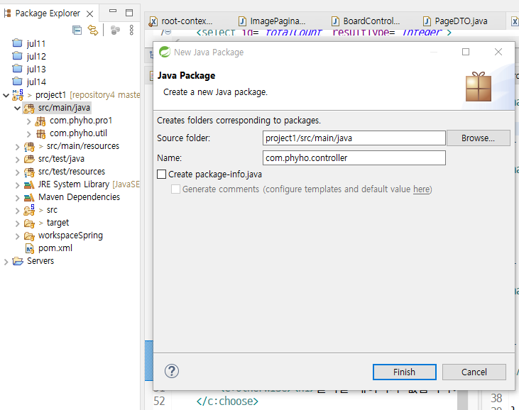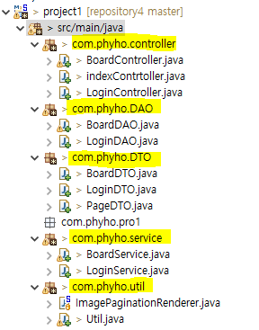 서비스, DAO, DTO들도 패키지 생성해서 같은 역할하는 파일들끼리 묶어주자~