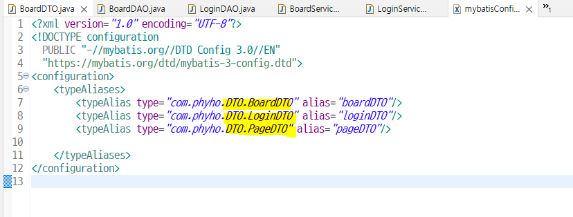 mybatisConfig.xml 파일에서 각각 DTO 파일들 경로 수정해주면
