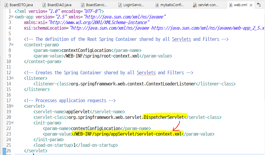 web.xml 에 보면 DispatcherServlet 경로가 나와있다