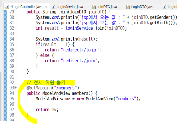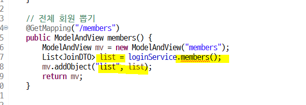 가져온 전체 회원정보를 "list"라는 이름으로 list에 담아 mv에 넣고 이 값을 리턴