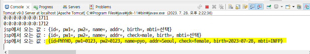 암튼 회원가입 폼 작성하고 가입하기 버튼 누르면 콘솔창에 8가지 정보 뜨는거 확인가능