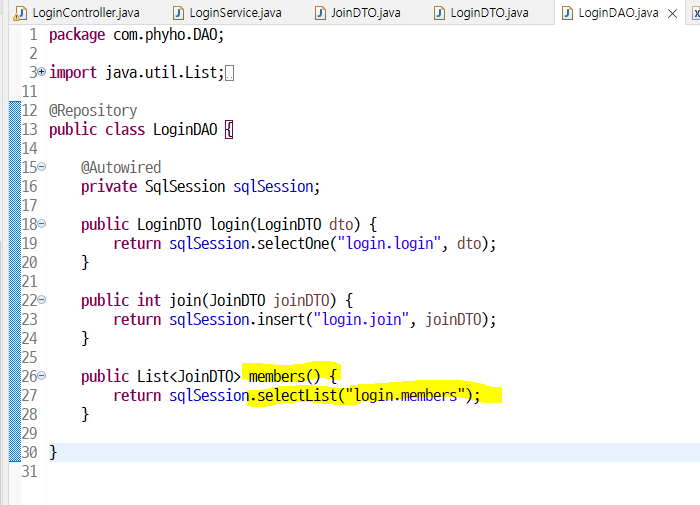 DAO에서도 members() 메소드로 mapper한테 일시켜
