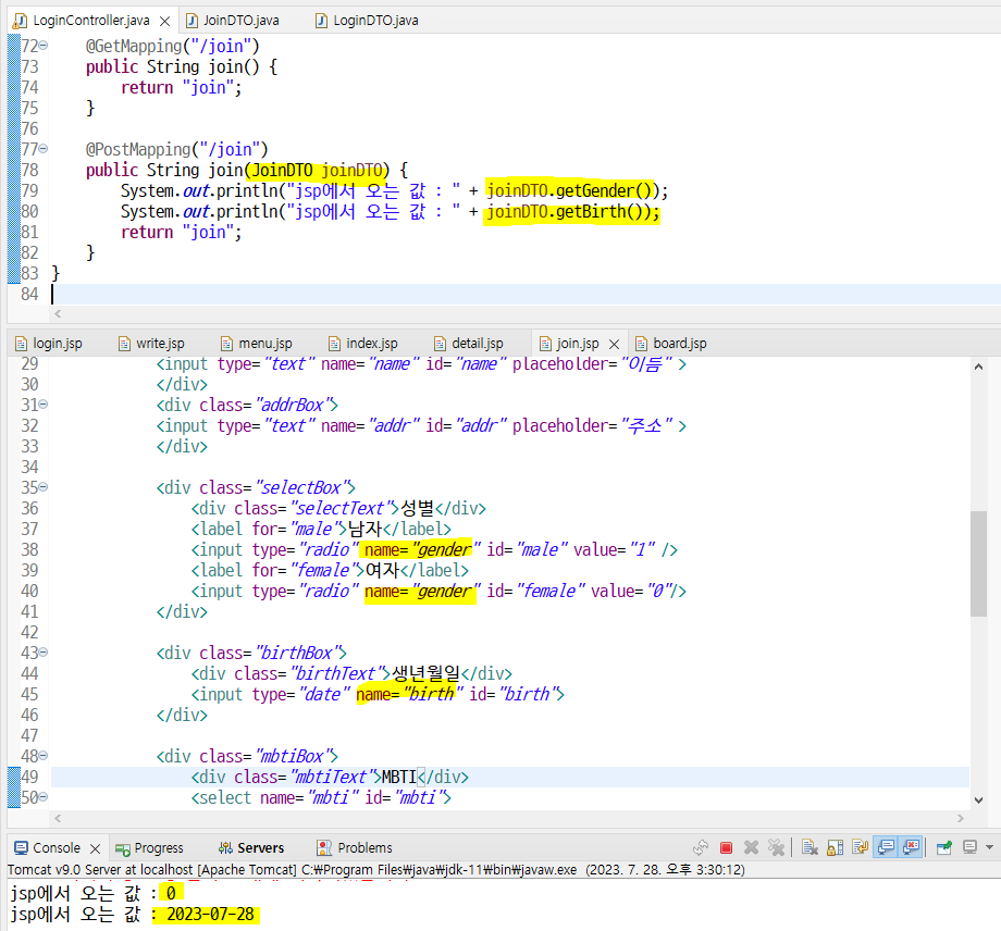 dto에서는 jsp에 있는 name에 해당하는 값을 알아서 가져온단다 대박
