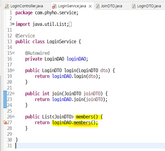 서비스에서도 members() 메소드 밑줄 클릭해서 DAO에 생성
