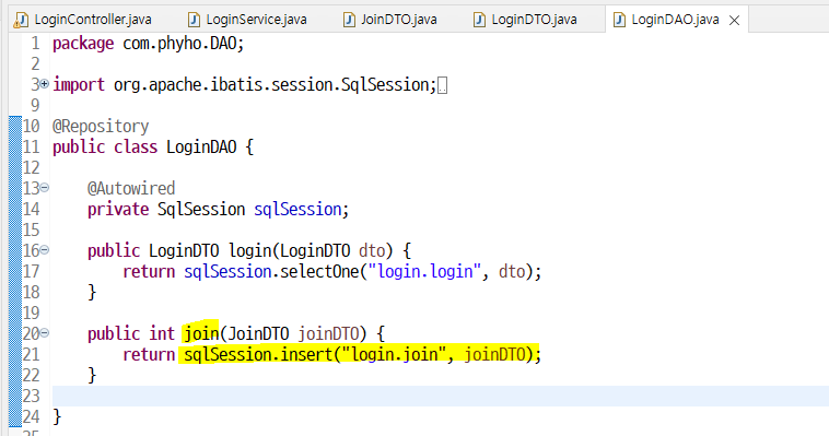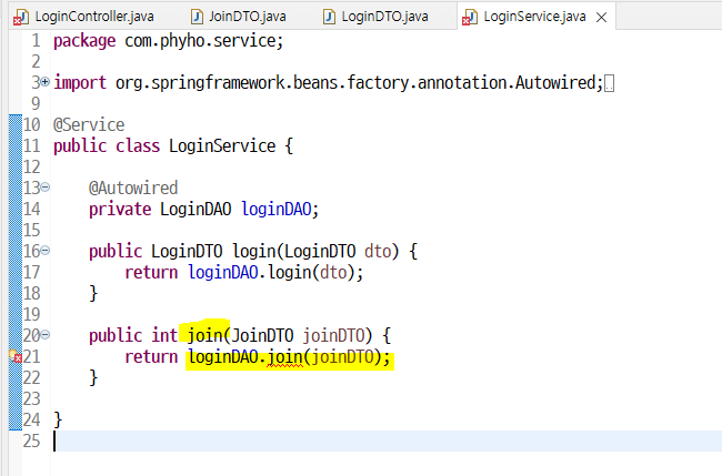 서비스에서도 밑줄 눌러서 DAO에 join() 메소드 생성