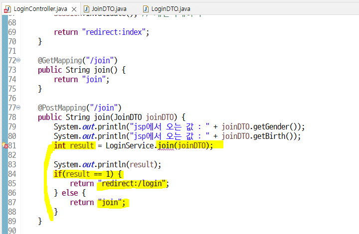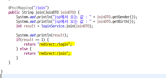 if 조건문으로 만약 result 가 1이라면(로그인 성공) => 로그인 페이지로 이동