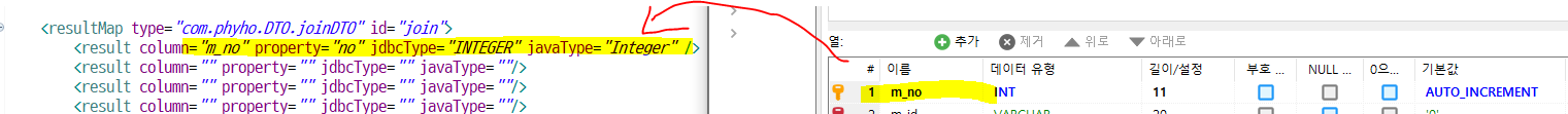 column은 필드명, property 은 dto 변수명, jdbcType 은 db에서 설정한 데이터유형, javaType 은 java에서의 데이터타입