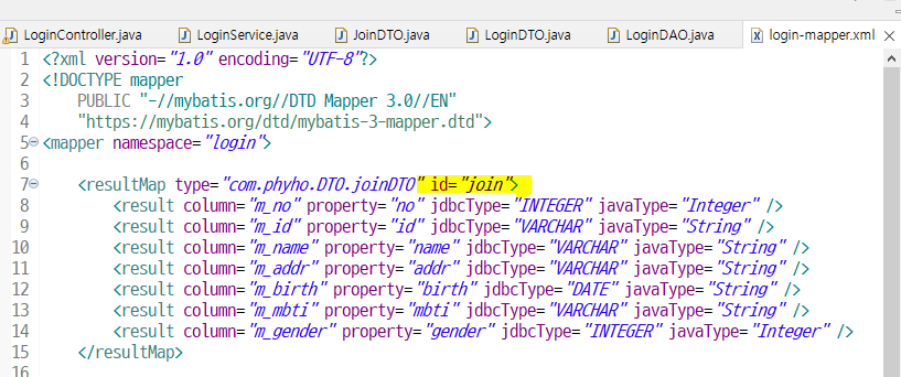 보내기만 할거니 parameterType 만 com.phyho.DTO.JoinDTO 로 써주고