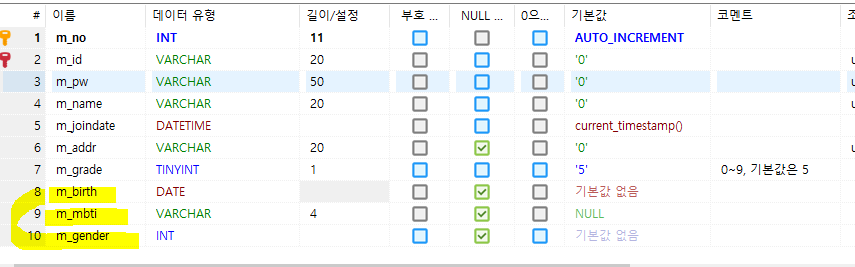 INSERT INTO members(m_id, m_pw, m_name, m_addr, m_birth, m_mbti, m_gender)