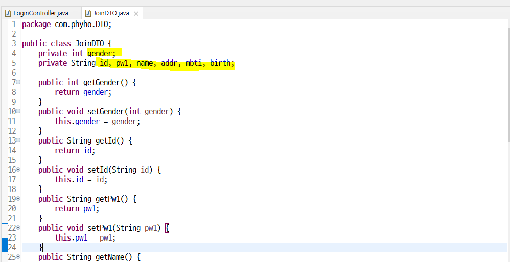 회원가입 창에 있는 정보들 변수로 선언해주고 getter/setter 생성