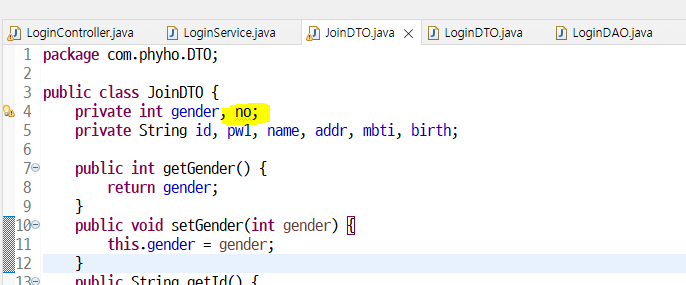 일단 아래처럼 no 변수추가하고, getter/setter 생성