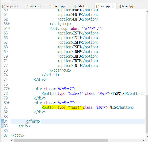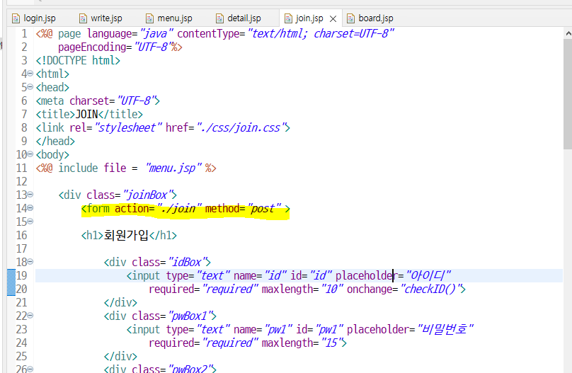 이제 회원가입 페이지 ( join.jsp) 꾸며줬으면 전체를 form태그로 묶어주기