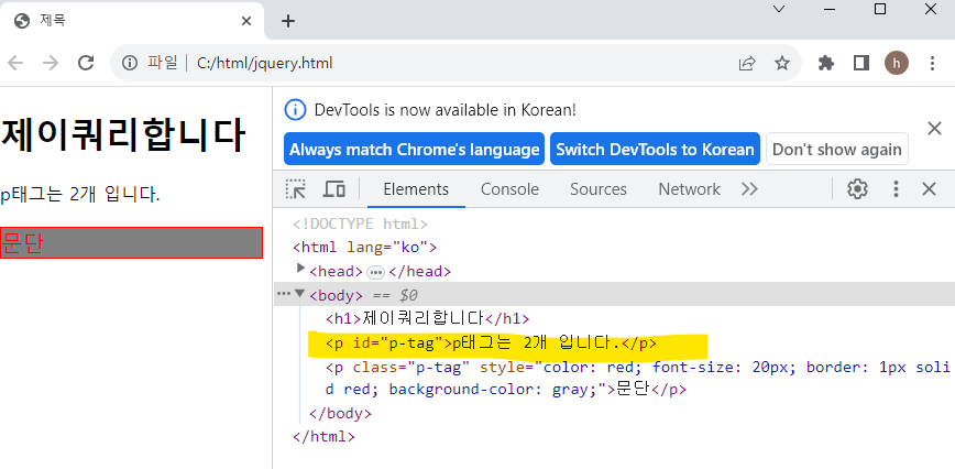 위의 p태그(id)를 클릭하면 아래 p태그(class) 색과 글자크기가 바뀌고 border가 생긴다. + 배경색이 회색으로 채워진다.