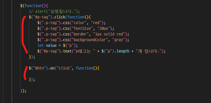 아래처럼 변수사용 안하고 바로 달러표시 p태그 선택해서 .length 사용가능