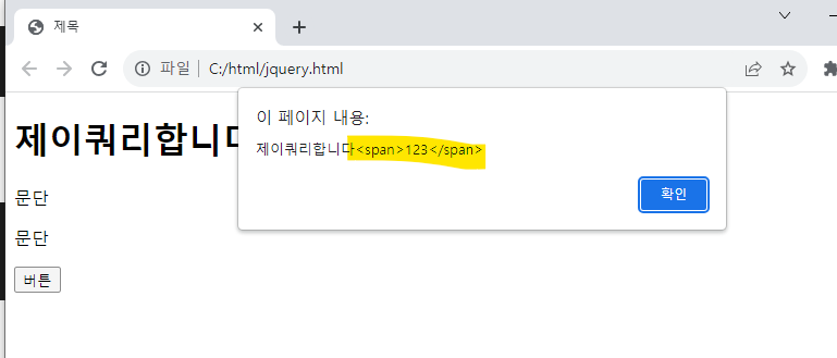 버튼 눌러보면 아래처럼 태그까지 불러오는 역할을 하는게 .html()