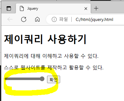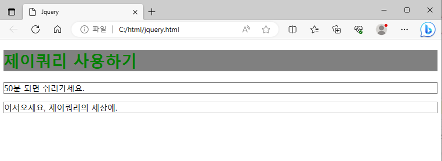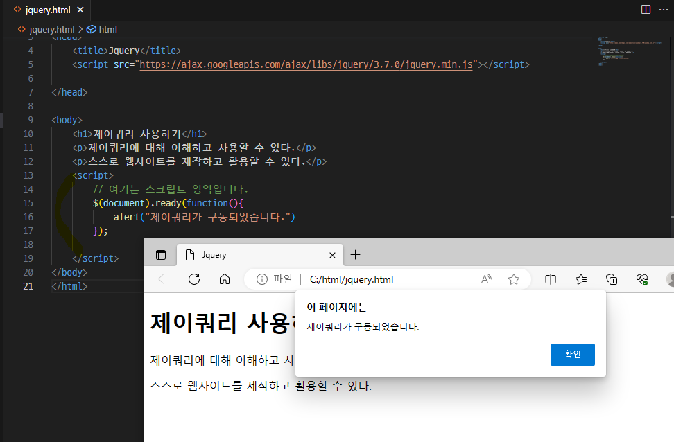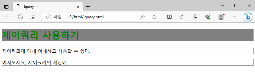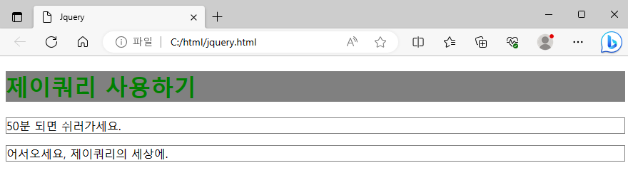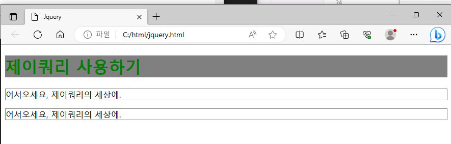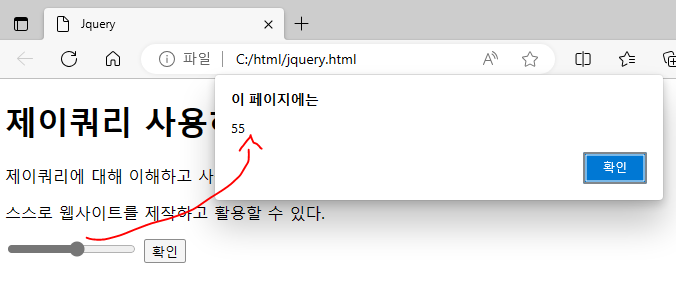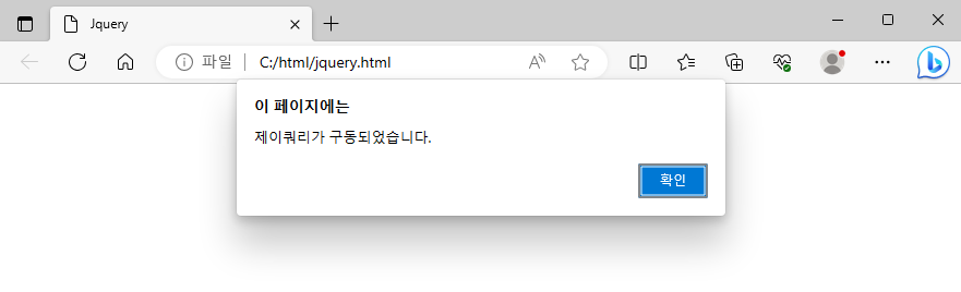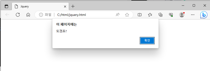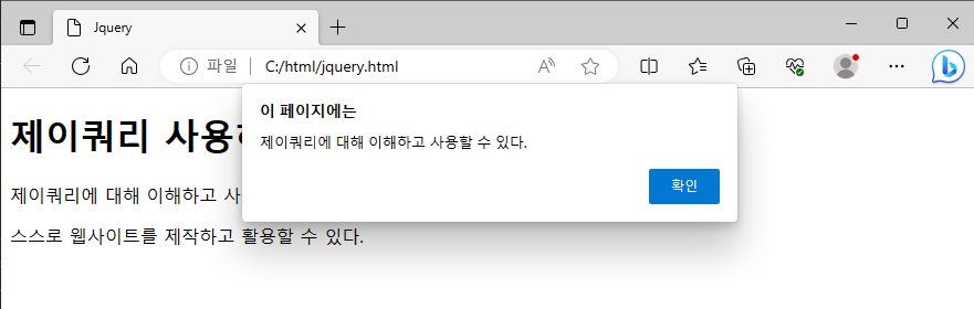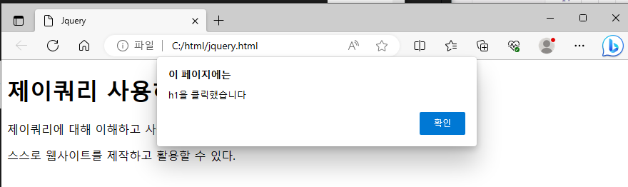 h1("제이쿼리 사용하기") 를 클릭하면 아래처럼 팝업이 뜬다