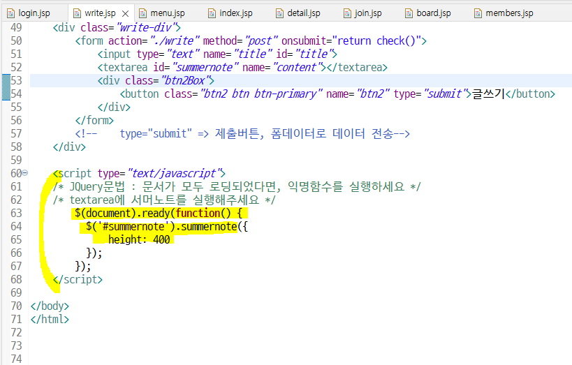 그래서 스프링 write.jsp 에서 jquery 를 맨 아래쪽에 써준거