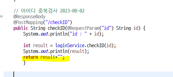 ( id값을 db값과 비교해서 일치하는 값의 count를 가져올거라 result 타입은 int)