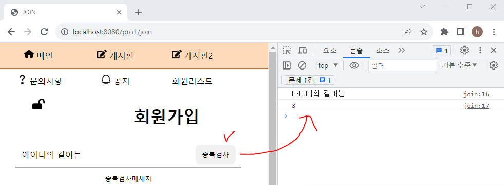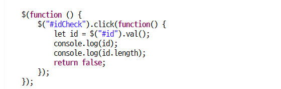 아이디 입력창에 값을 입력하고 중복검사 버튼 누르면 id 를 콘솔에 출력