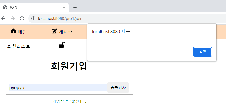 결과값이 1이면 "이미 등록~ " 문구가 뜨고