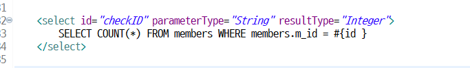 mapper에서는 입력한 id 와 db에 저장된 id (m_id) 를 비교해서 일치하는 값의 count를 가져오는 쿼리문 실행