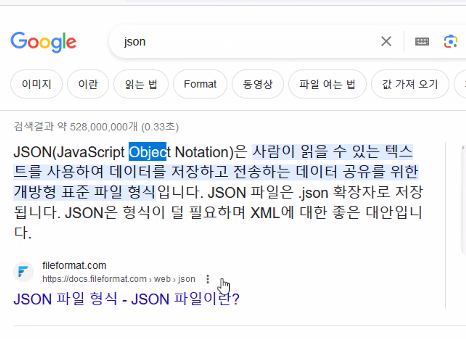 JSON 형식의 object는 name(key) / value 쌍들의 비순서화된 SET