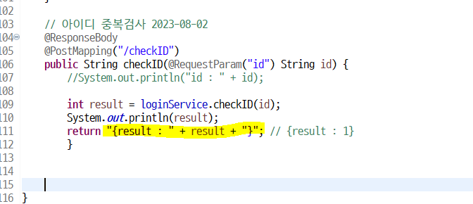 json 방식으로 id를 되돌려줄 예정 => { result : 0 } 형태로
