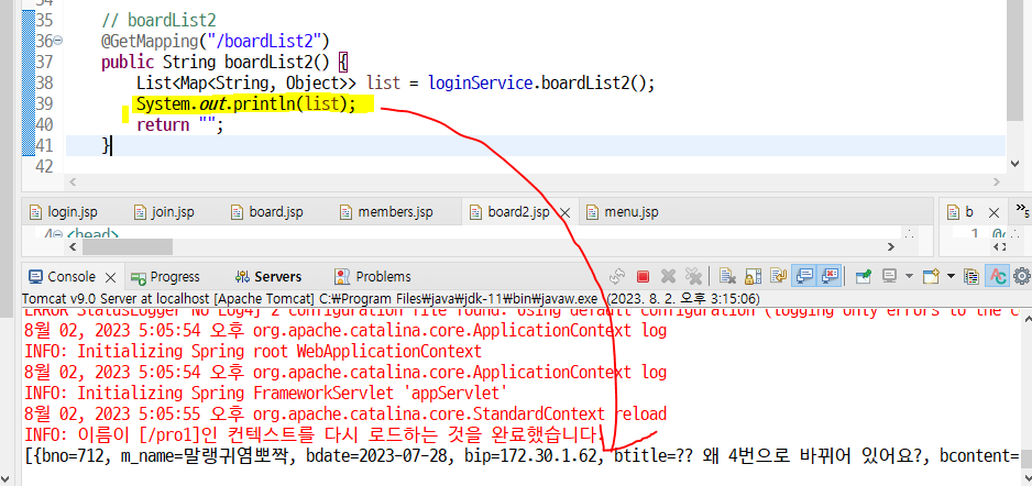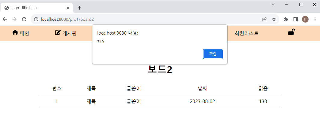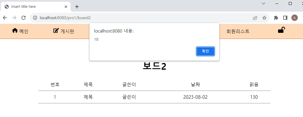 게시판 2를 눌러보면 브라우저에서는 에러가 뜨지만 데이터 자체는 잘 불러와진다.