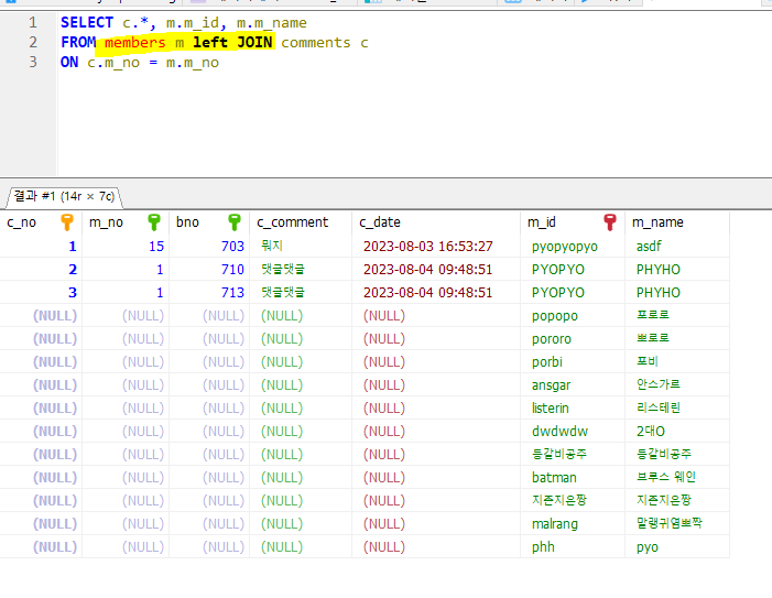 그래서 댓글 안쓴 member들도 가져오지만 댓글을 쓴적이 없으니 comments 테이블 영역은 null값으로 표시된다.