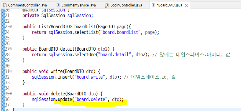 boardDAO 에서 delete 메소드를 update로 수정해준다