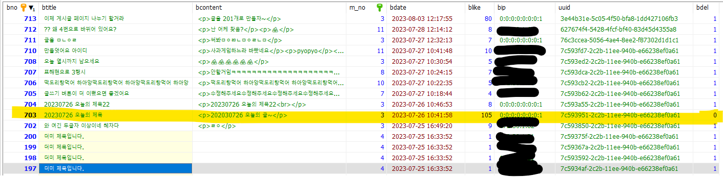 db에서 확인해보면 bdel 값이 0으로 바껴있다.