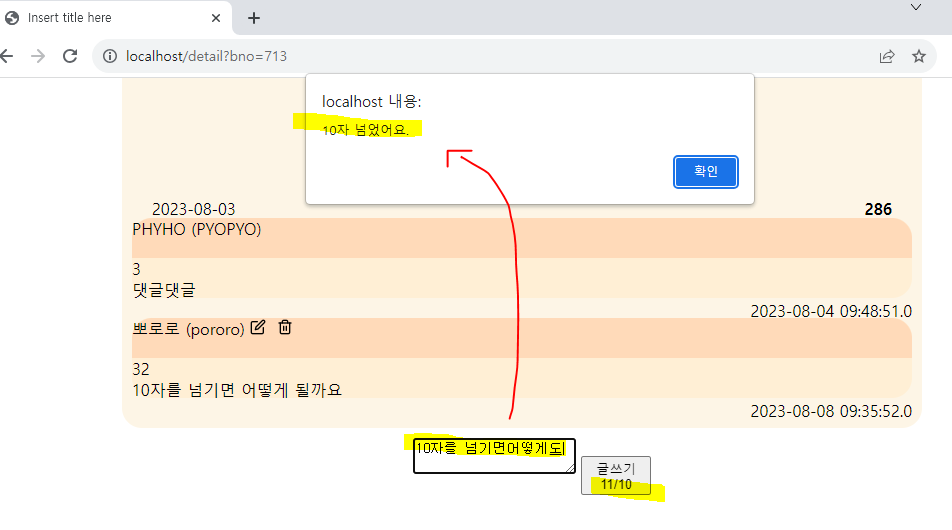 600자 이상 제한 걸어주자 (일단 테스트용은 10자로 하자)