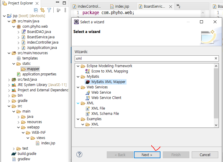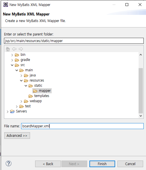 mapper 폴더 내부에 boardMapper.xml 파일 생성