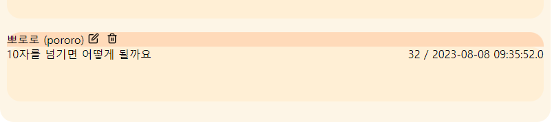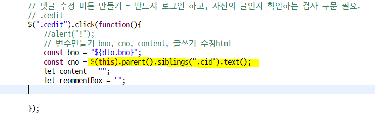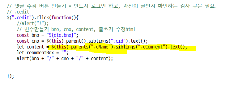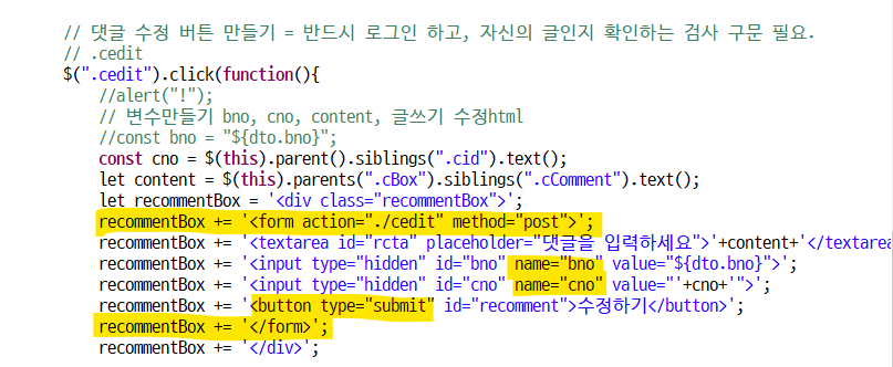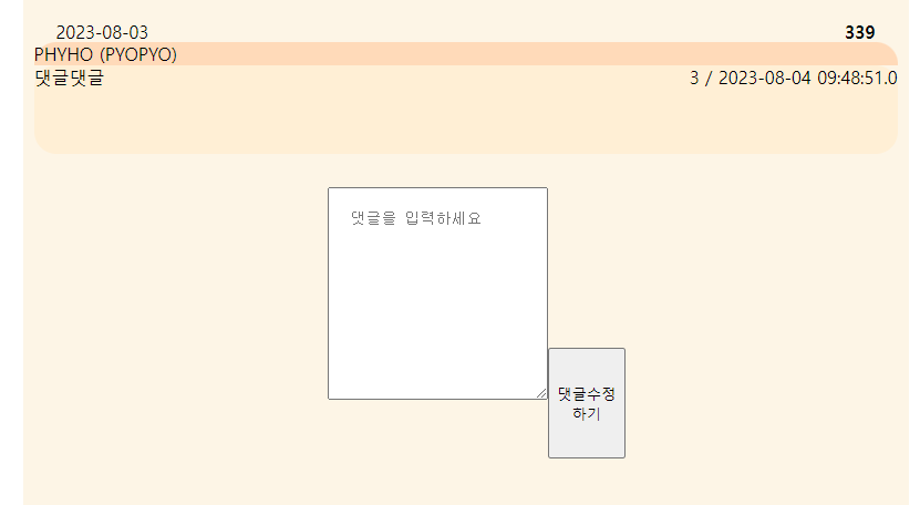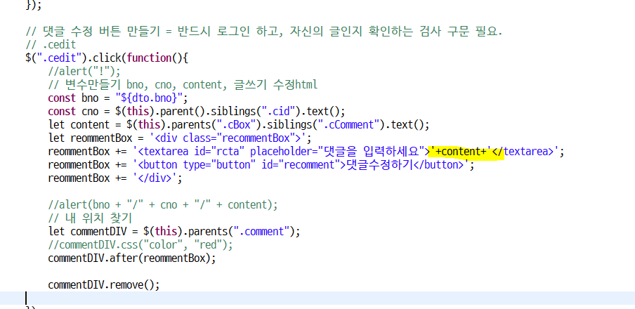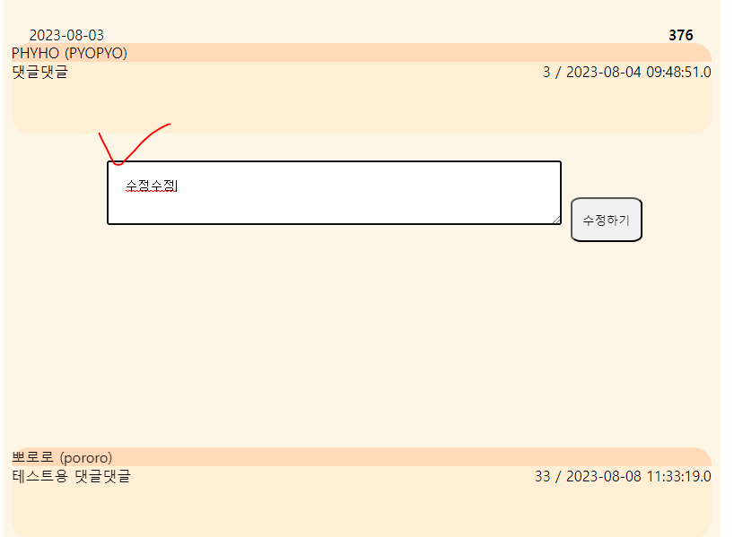 이제 수정버튼을 눌러서 나온 입력창에 원래의 댓글을 넣어준다. (수정하기 편하게 하기위해)