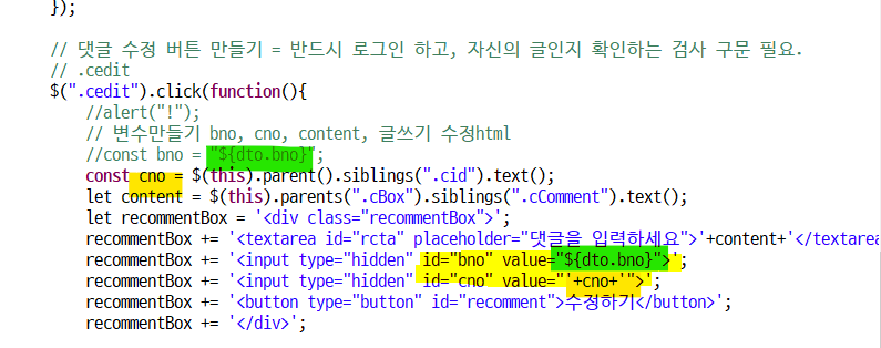 숨겨진 input 창을 생성해서 value값에 bno와 cno를 넣어준다. (bno도 변수로 사용해도 되지만 아래처럼 바로 사용 가능)