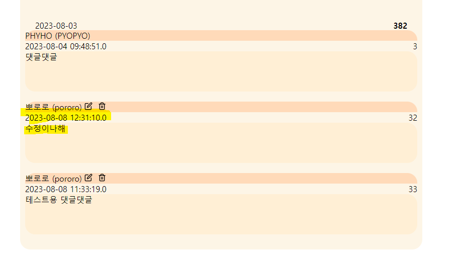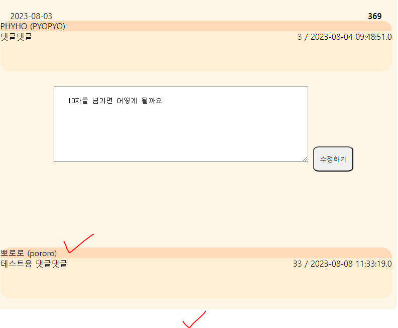 댓글을 수정해서 쓰고 수정하기 버튼을 눌러보면