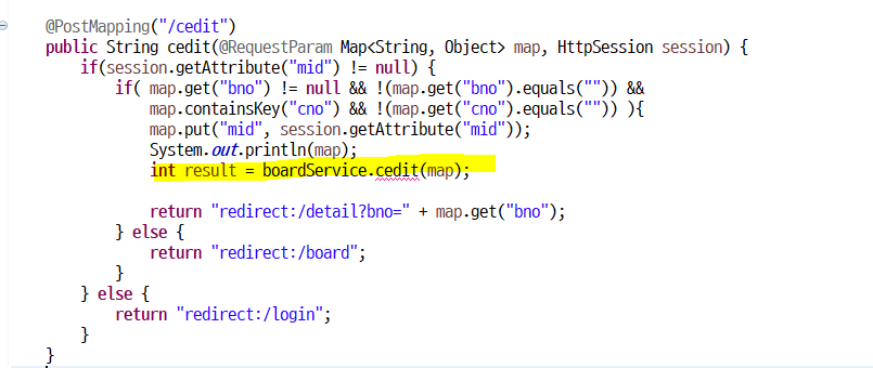 이제 서비스에게 cedit() 메소드로 일을 시켜서 결과값을 result에 담는다.