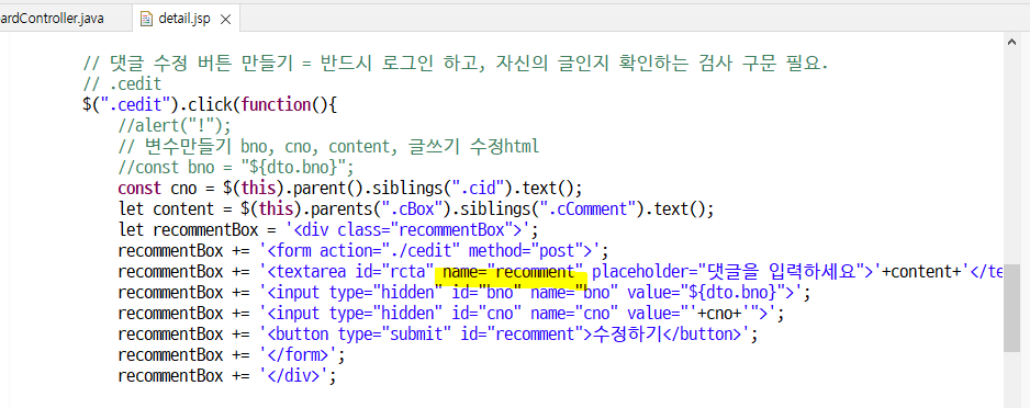 textarea(댓글수정창)에도 recomment라고 name을 달아준다