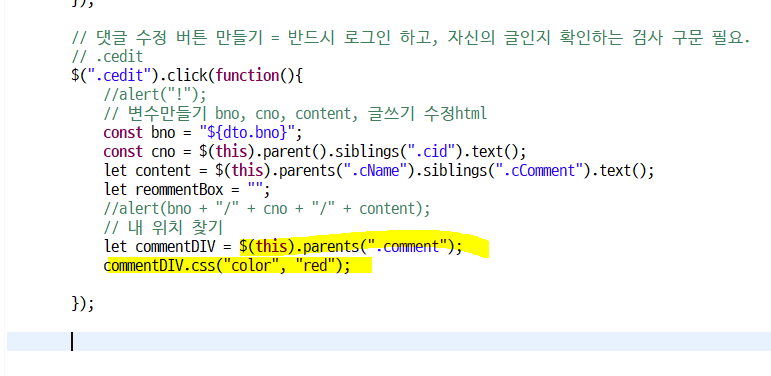 수정버튼을 눌렀을 때 해당 댓글창의 전체 글자색이 빨간색으로 변한다.